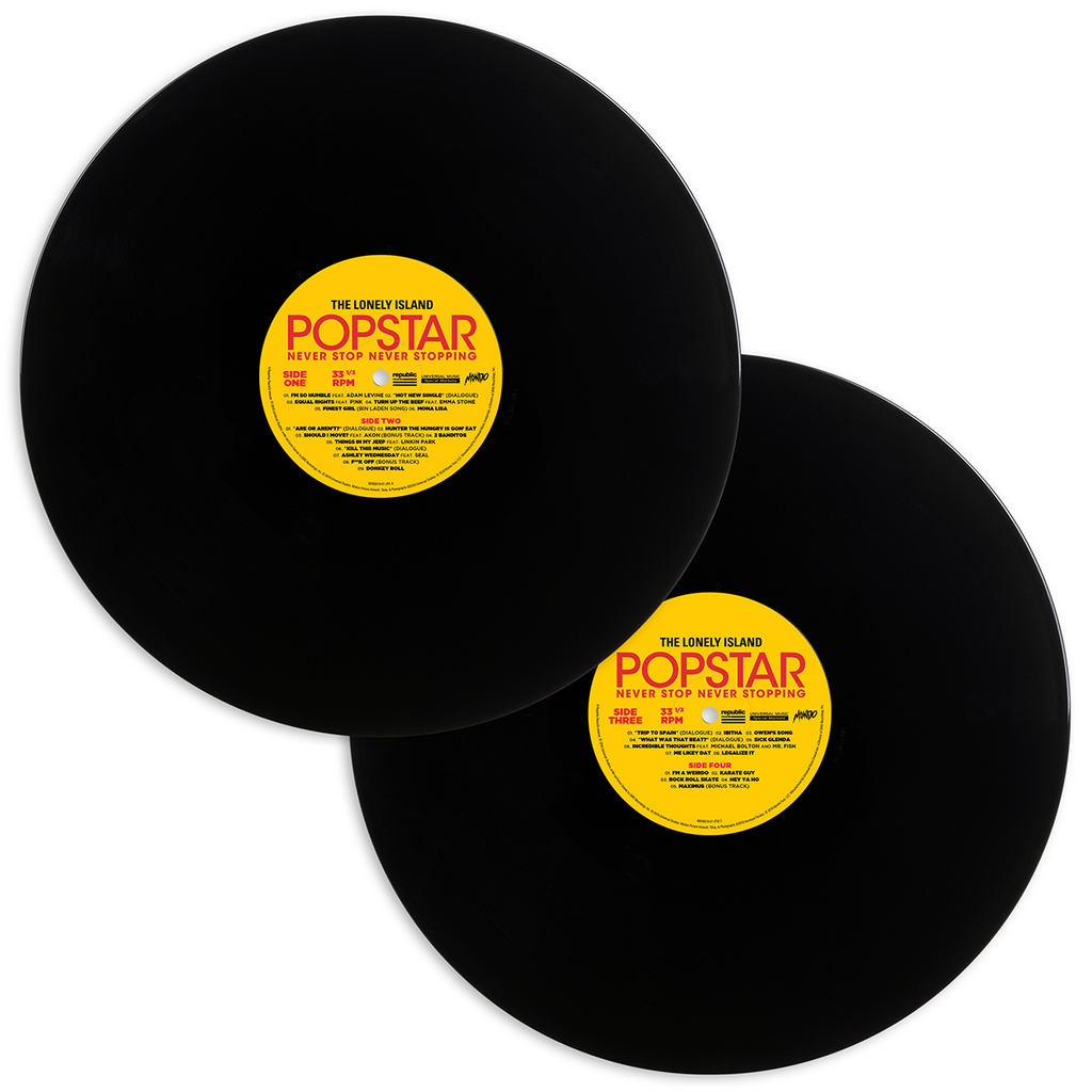 The Lonely Island is proud to present the premiere vinyl release of the original soundtrack to POPSTAR: NEVER STOP NEVER STOPPING, courtesy of Mondo Music. Including nearly two dozen original, comedic pop and hip-hop songs performed by The Lonely Island and featuring artists such as P!NK, Adam Levine, Michael Bolton and Seal, the soundtrack is pressed on 2x 180 Gram Black Vinyl.